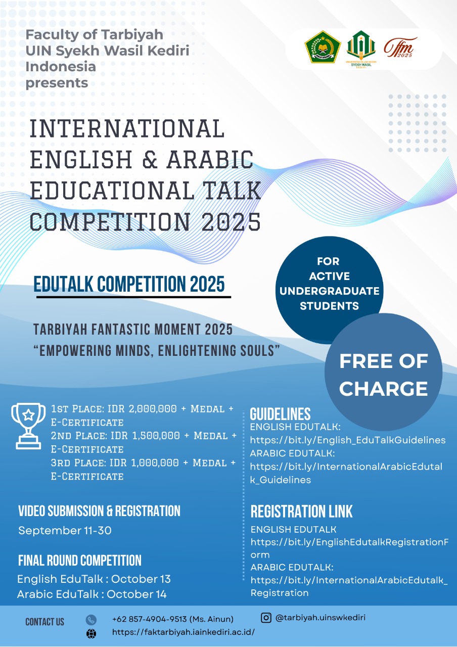 Read More English and Arabic Edutalk Competition 2025 - Tarbiyah Fantastic Moment Hosted by UIN Syekh Wasil Kediri, IndonesiaUIN Syekh Wasil Kediri with great enthusiasm announces the English and Arabic Edutalk Competition 2025, an international platform for students to demonstrate